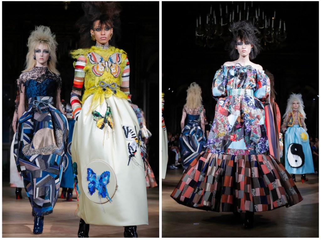 Ms. Jongstra’s intense materials combined into V&R’s staple dramatic shapes, became more and more colorful—from moonscapes with bats to sunrises with flowers and butterflies. The looks contained intricate patchworks from vintage-sourced fabrics as well as reconstituted needle-punched textiles, so that the effect fell somewhere between quilt and Klimt (i.e famous symbolist painter Gustav Klimt).